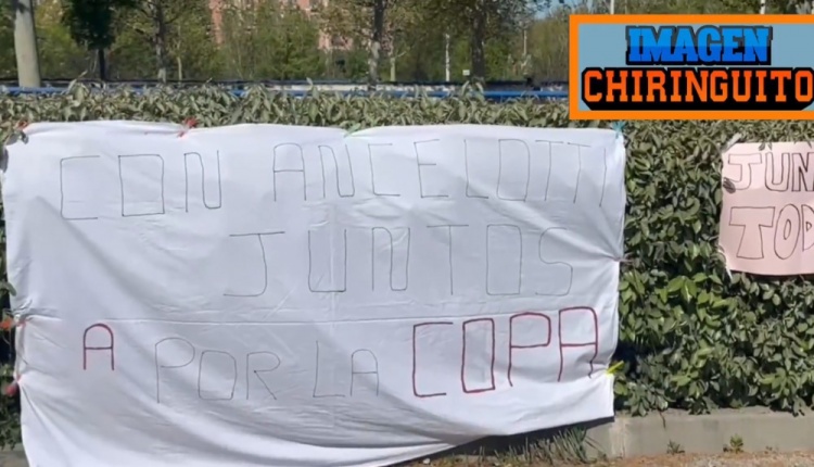 皇马球迷训练场外挂横幅鼓励球员:和安帅一起,拿下国王杯冠军 -